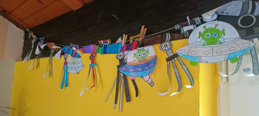 U našoj školi Svjetski tjedan svemira obilježavao se svakoga dana kroz brojne zanimljive i kreativne aktivnosti! U ponedjeljak je na satu tehničke kulture naša osmašica Saša sa svojim prijateljima iz razreda izradila plakat s planetima koji je poslužio kao učilo drugim učenicima. Na satovima razrednika svaki je razred sa svojim razrednikom nacrtao i obojao svoj teleskop te ga izložio na pano. Učenici 7.b razreda izradili su mali 3D planetarij, naš mali astronom Jakov Levačić izradio je model kretanja Zemlje i Mjeseca oko Sunca.