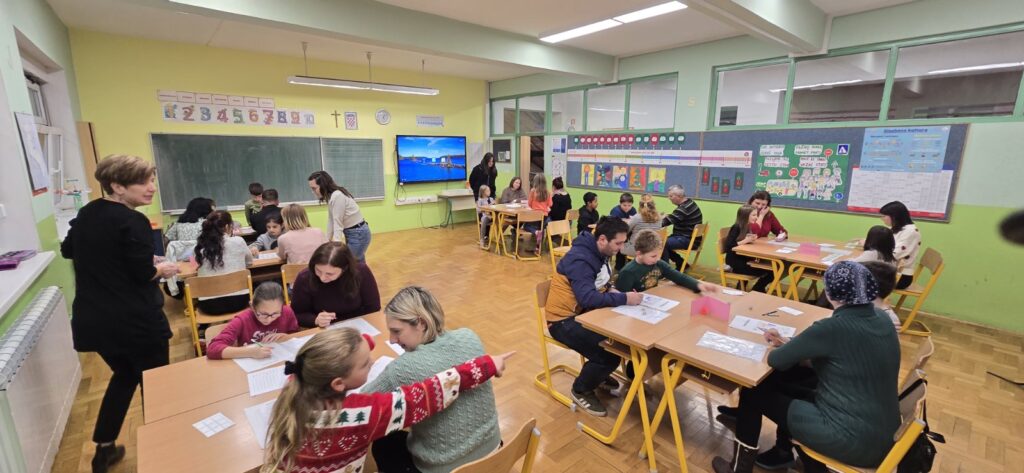 Večer matematike organizira Hrvatsko matematičko društvo. To je skup interaktivnih radionica koje potiču izgradnju pozitivnog stava učenika prema matematici. Na taj način otkriva se zabavna strana matematike, stvaraju se nove ideje o tome što je matematika i čime se ona bavi. Iako nismo svjesni vlastitog talenta, svakodnevno svi uspješno rješavamo različite matematičke probleme. U našoj školi Večer matematike održana je 4.12.2025. s početkom u 18 sati. Sudjelovao je velik broj učenika od 1.- 8. razreda zajedno sa svojim roditeljima. Učenici i njihovi roditelji dobili su upute u koji razred da se smjeste i način na koji će rješavati matematičke zadatke. Atmosfera je bila vrlo ugodna, a zabavna strana matematike je doista bila otkrivena u punom smislu.